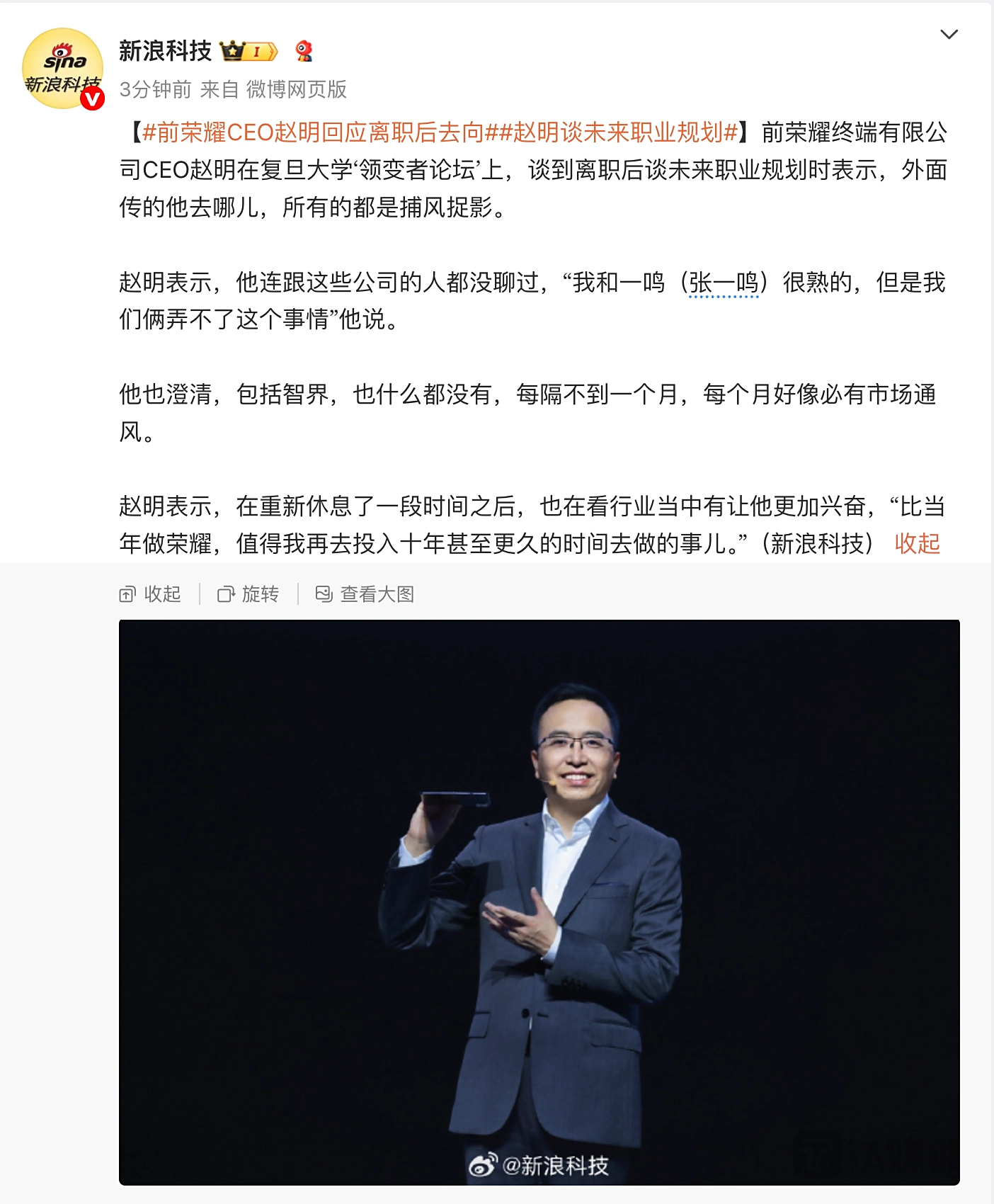 IT之家 9 月 17 日音问,据新浪科技,前荣耀末端有限公司 CEO 赵明在复旦大学“领变者论坛”上谈到了我方从老东家辞职后的改日相关。