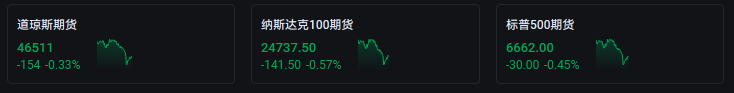 好意思股期货延续跌势,谈指期货跌0.3%,纳指100期货跌0.6%,标普500指数期货跌0.5%。