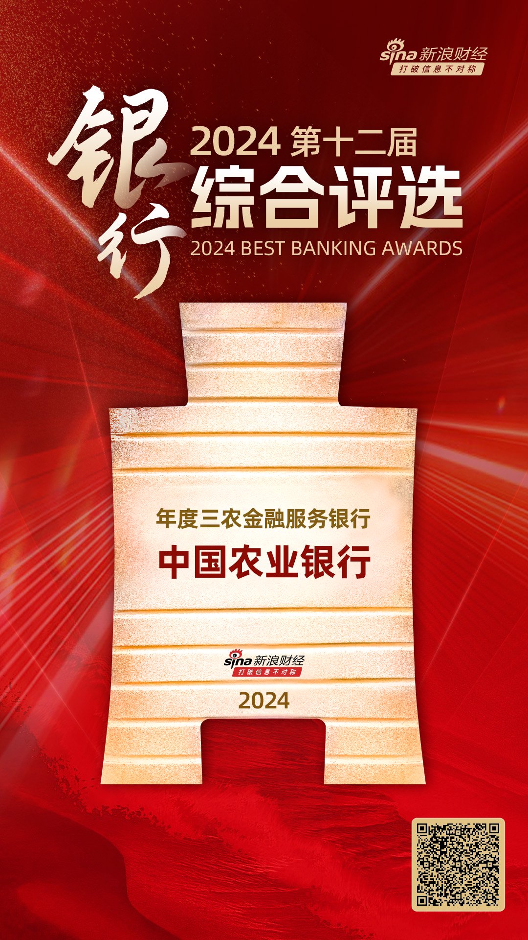 1月23日金融一线讯息,由新浪财经主持的“2024(第十二届)银行概括评比”算作获奖名单本日追究揭晓!中国农业银行获评“年度三农金融业绩银行”。